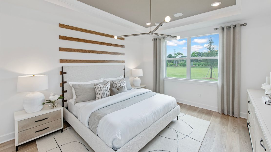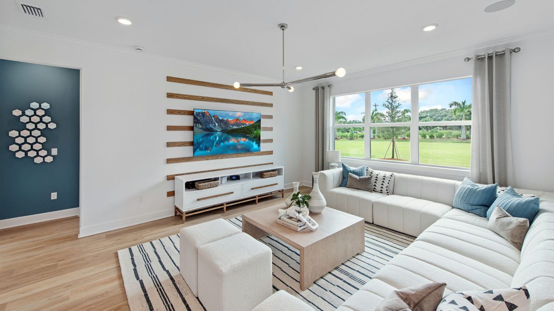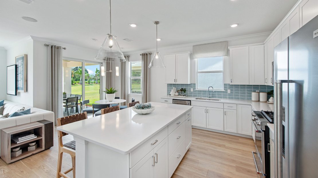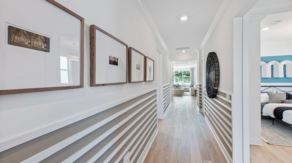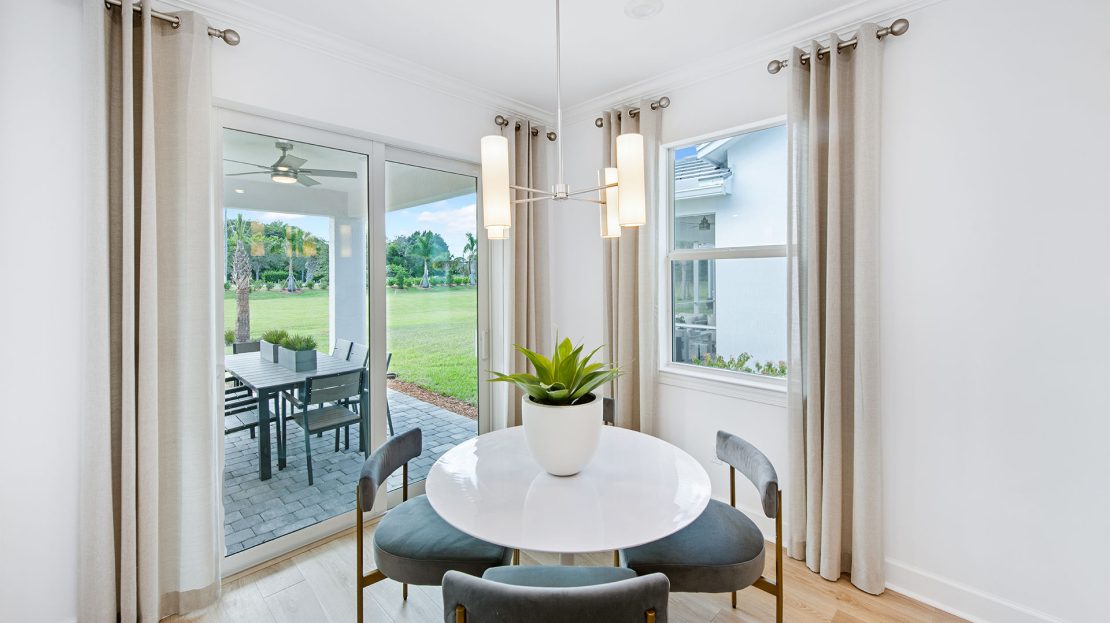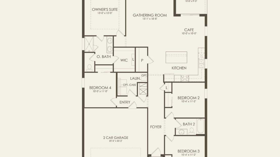 Leading off the foyer are three secondary bedrooms and designated laundry space in the new construction Highgate home. The foyer opens up to the gourmet kitchen, connected café, and spacious gathering room. Unwind in the private owner’s suite with a tranquil bathroom and walk-in closet or find your retreat on the optional extended covered lanai.