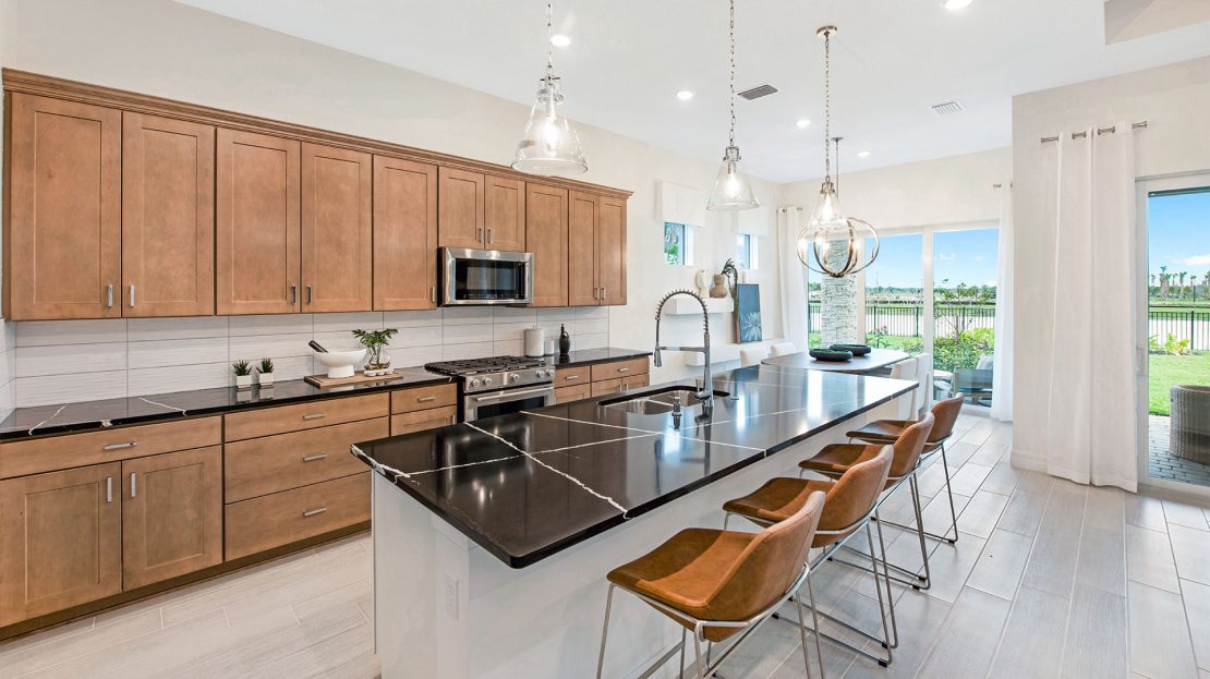 The spacious kitchen and open gathering room offer plenty of room to entertain family and friends in this new construction home. The sliding glass doors open up to the covered lanai – add the covered lanai extension option to create the ultimate indoor/outdoor living space. You and your guests will have all the space you need in the Prestige.