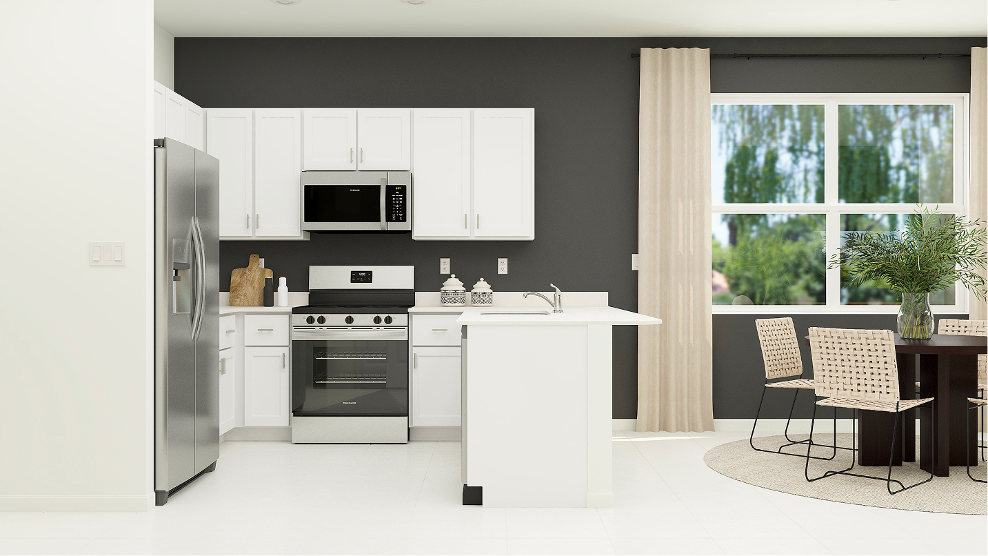 This two-story townhome showcases a contemporary open design among the first-floor kitchen, living room and dining room to promote seamless transitions between spaces. Nearby is a covered patio for outdoor relaxation. Upstairs caters to intimate spaces with a versatile loft area, two secondary bedrooms with shared access to a Jack-and-Jill style bathroom, along with the private owner’s suite complemented by an oversized walk-in closet.