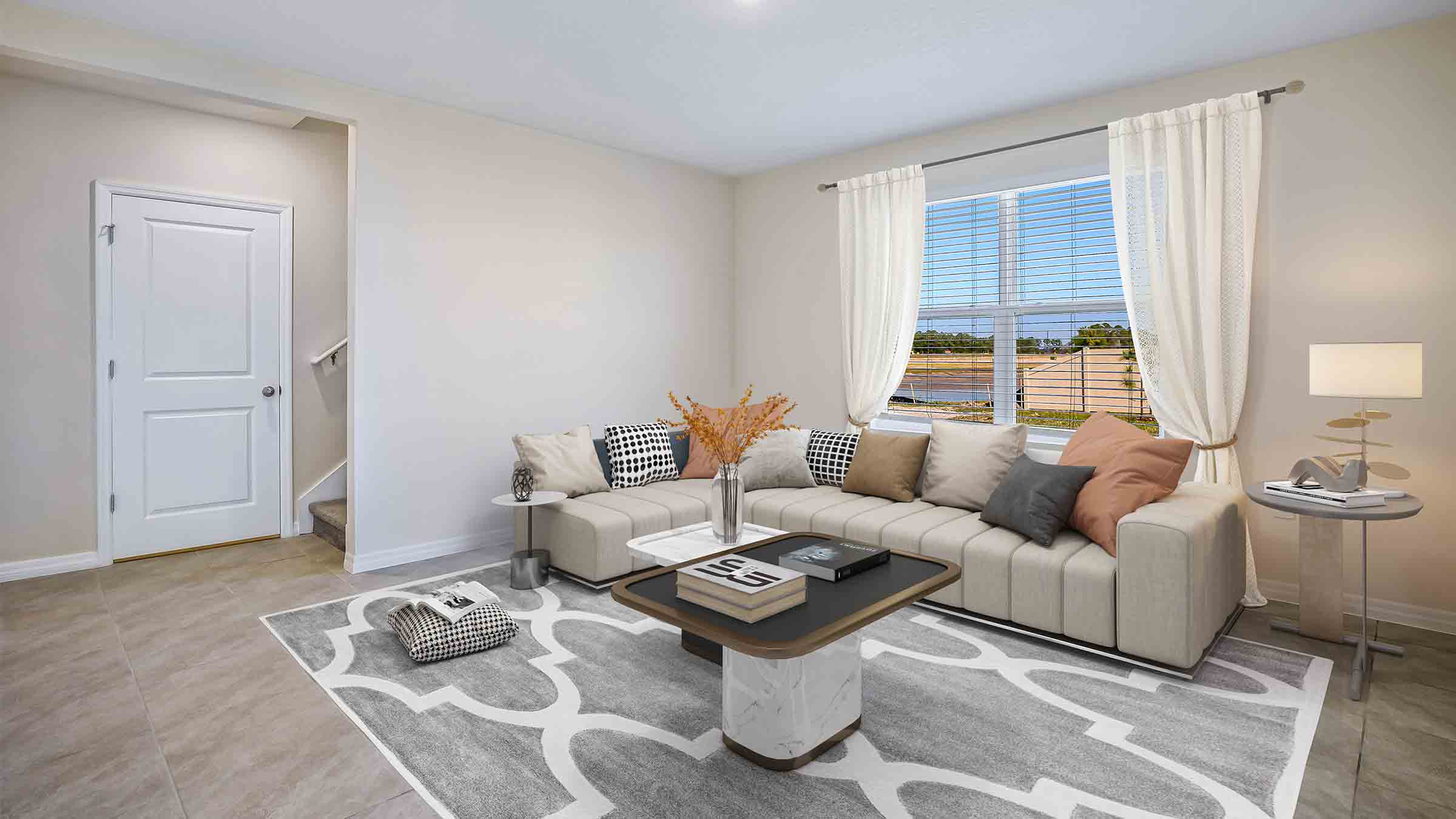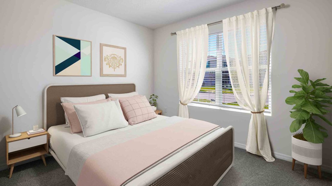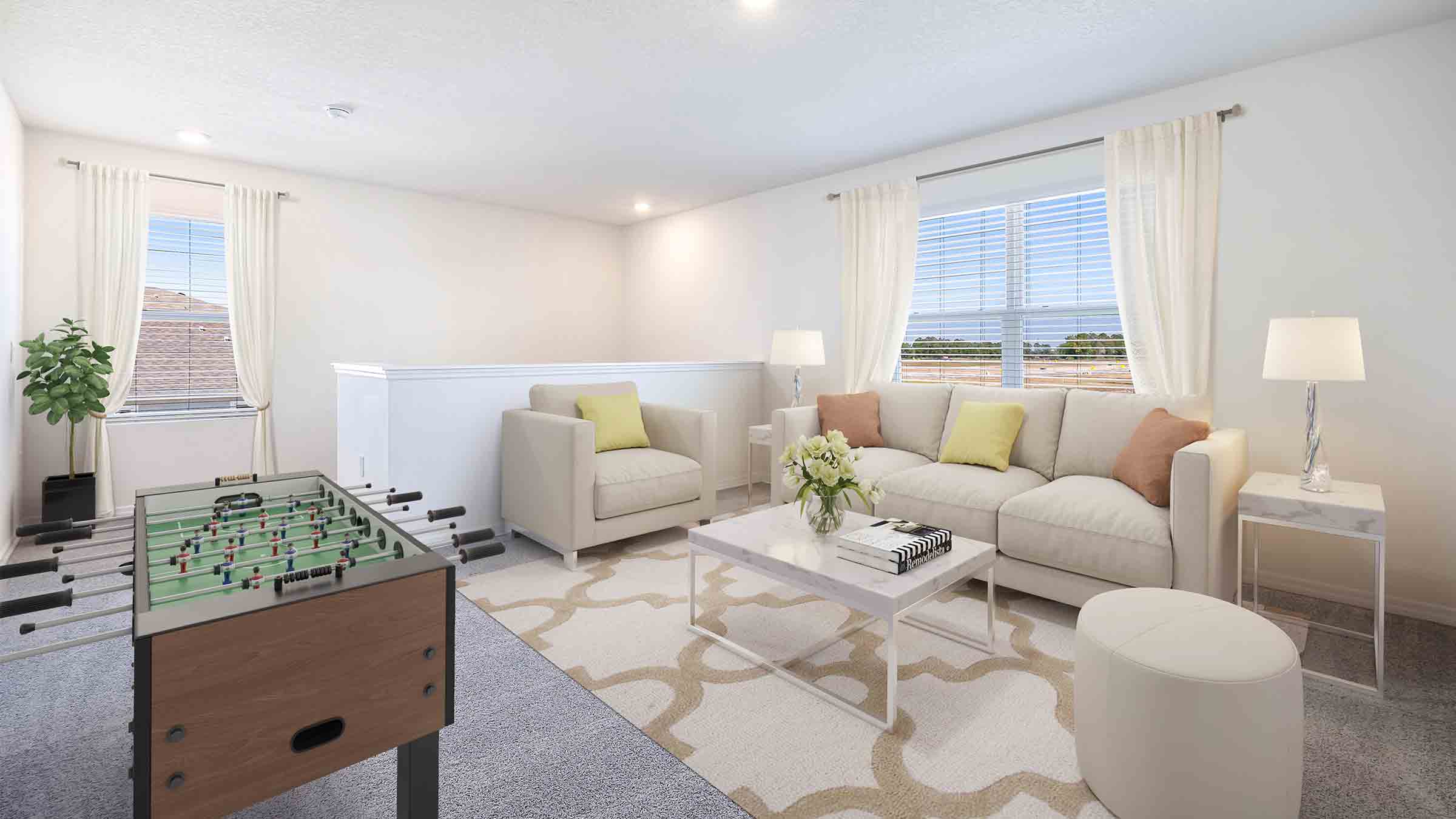This two-story concrete-block-constructed home features an open concept first-floor living space with a guest bedroom on the first floor. The stairs to the second story land in a spacious bonus room fit to serve as an additional entertainment space, a playroom, or an office. Bedroom 1 includes an ensuite bath with a roomy walk-in closet. The laundry room is perfectly situated between the other two bedrooms next to the third bathroom. This home comes with a refrigerator, built-in dishwasher, electric range, microwave, washer, and dryer. Pictures, photographs, colors, features, and sizes are for illustration purposes only and will vary from the homes as built. Home and community information including pricing, included features, terms, availability and amenities are subject to change and prior sale at any time without notice or obligation. CBC039052.