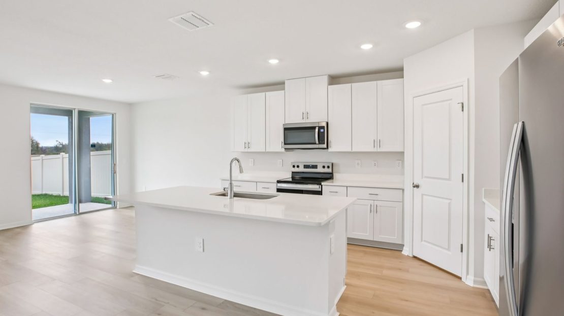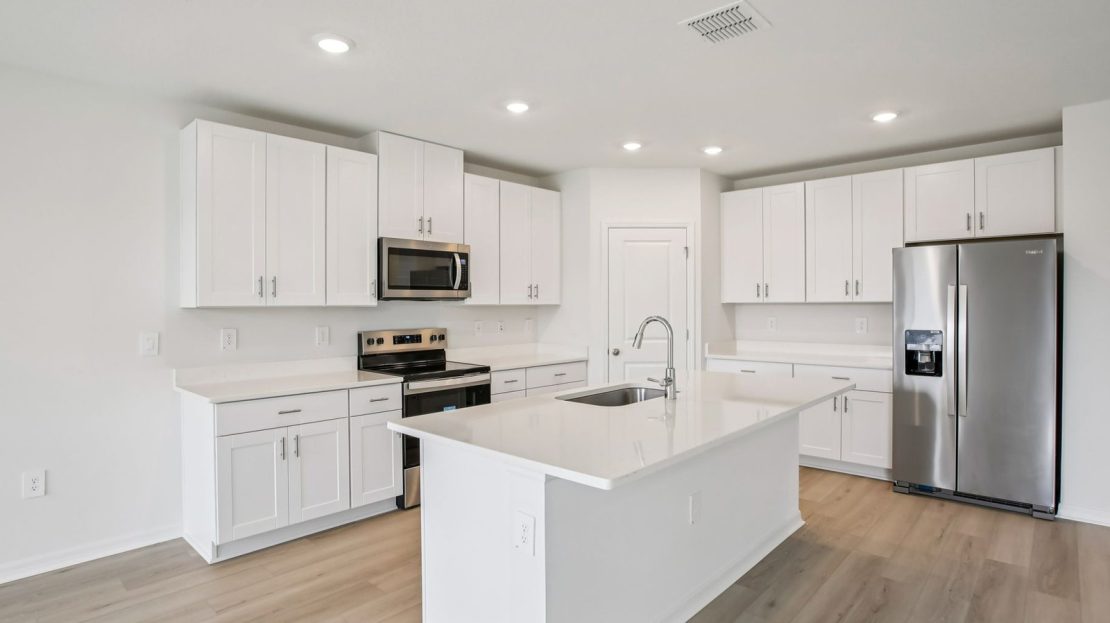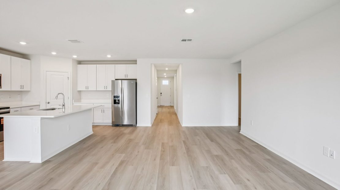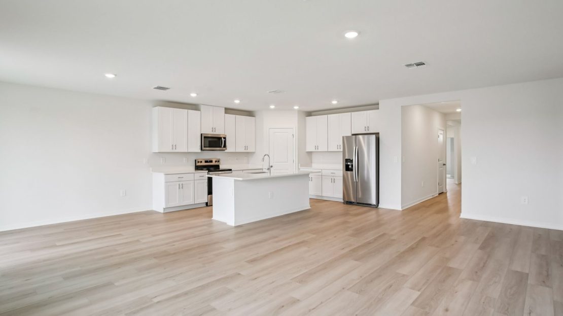 The Essex’s versatile flex space in this home can be used as a gaming area, home office or hobby space. Kitchen features a work island that overlooks the great room and dining area. Three full baths make morning routines easier.