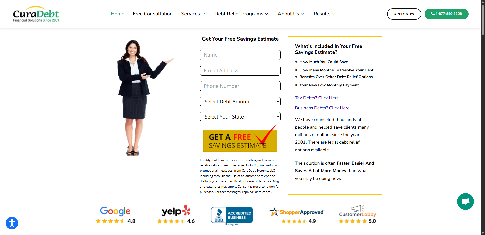 CuraDebt is a highly rated debt settlement and debt relief company, with an average review score of 4.9/5 on the ShopperApproved platform and 1,000+ five-star reviews on CustomerLobby. It guarantees to charge the lowest fees of any similarly rated debt resolution program.